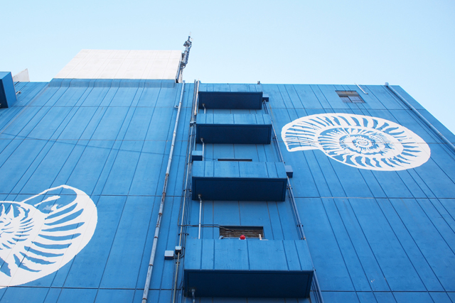 「Gallery 916」は新交通ゆりかもめ 竹芝駅の目の前。青い色が特徴の建物です。